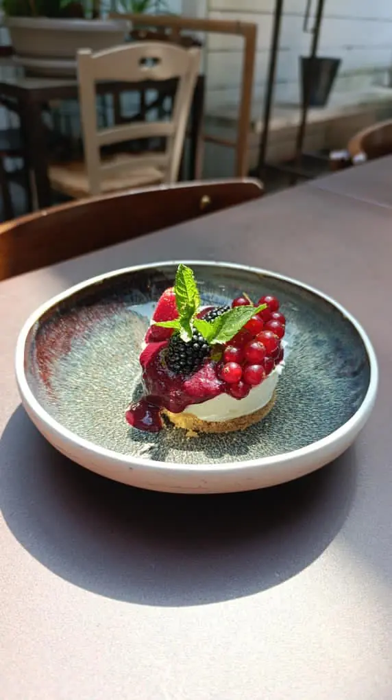Cheese cake con formaggi top secret accompagnata da una composta fatta in casa di frutti di bosco e frutti di bosco freschi, su una base di morbido biscotto
