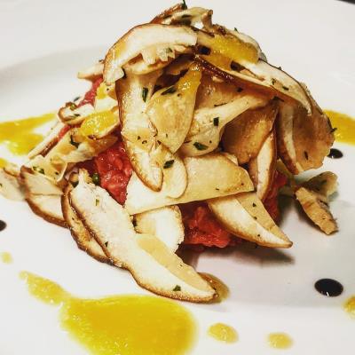 TARTARA DI GARRONESE VENETA CON FUNGHI PORCINI SPADELLATI, CIPOLLA ROSSA DI TROPEA IN CARPIONE E UN JOUS TIEPIDO.