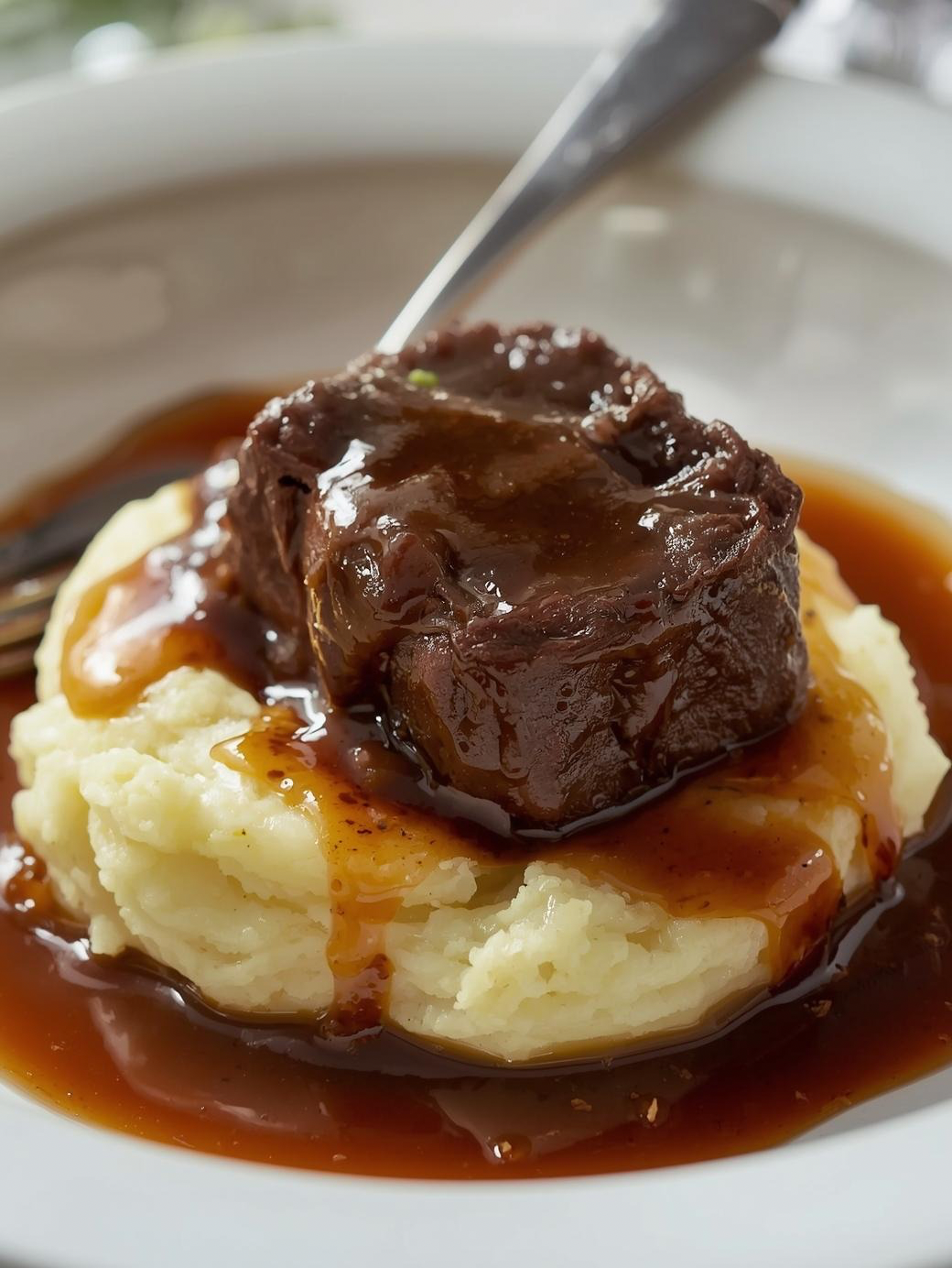 guancetta di manzo cotta a bassa temperatura servita con purè di patate.