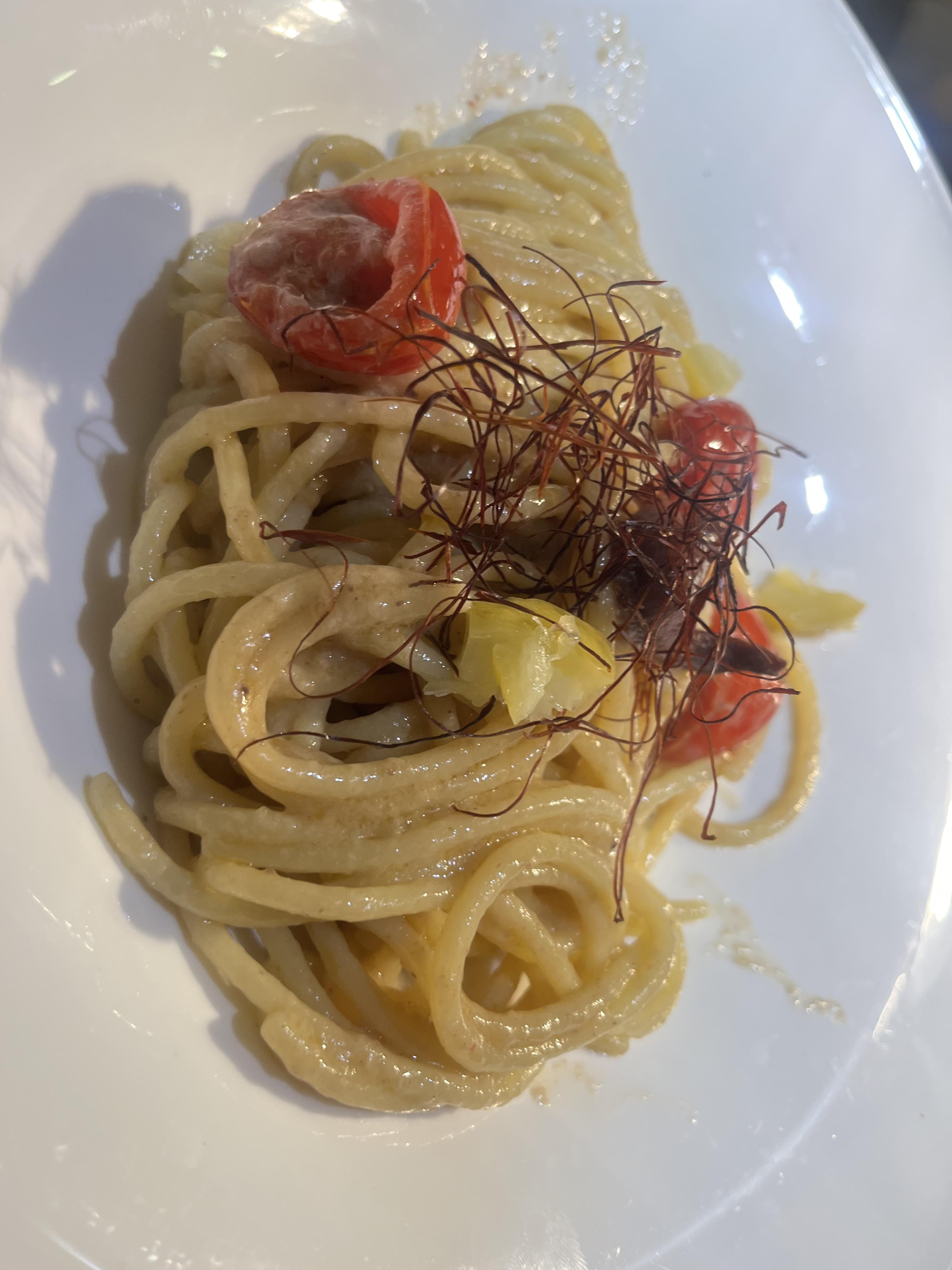 Bigolo di pasta fresca mantecati con una crema a base di acciughe del mar cantabrico, pomodorini confit e limone condito